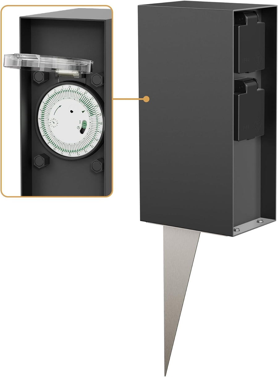 ledscom.de Garten-Steckdosensäule POMI mit Erdspiess für aussen, IP44, Timer/Zeitschaltuhr, 2-fach,