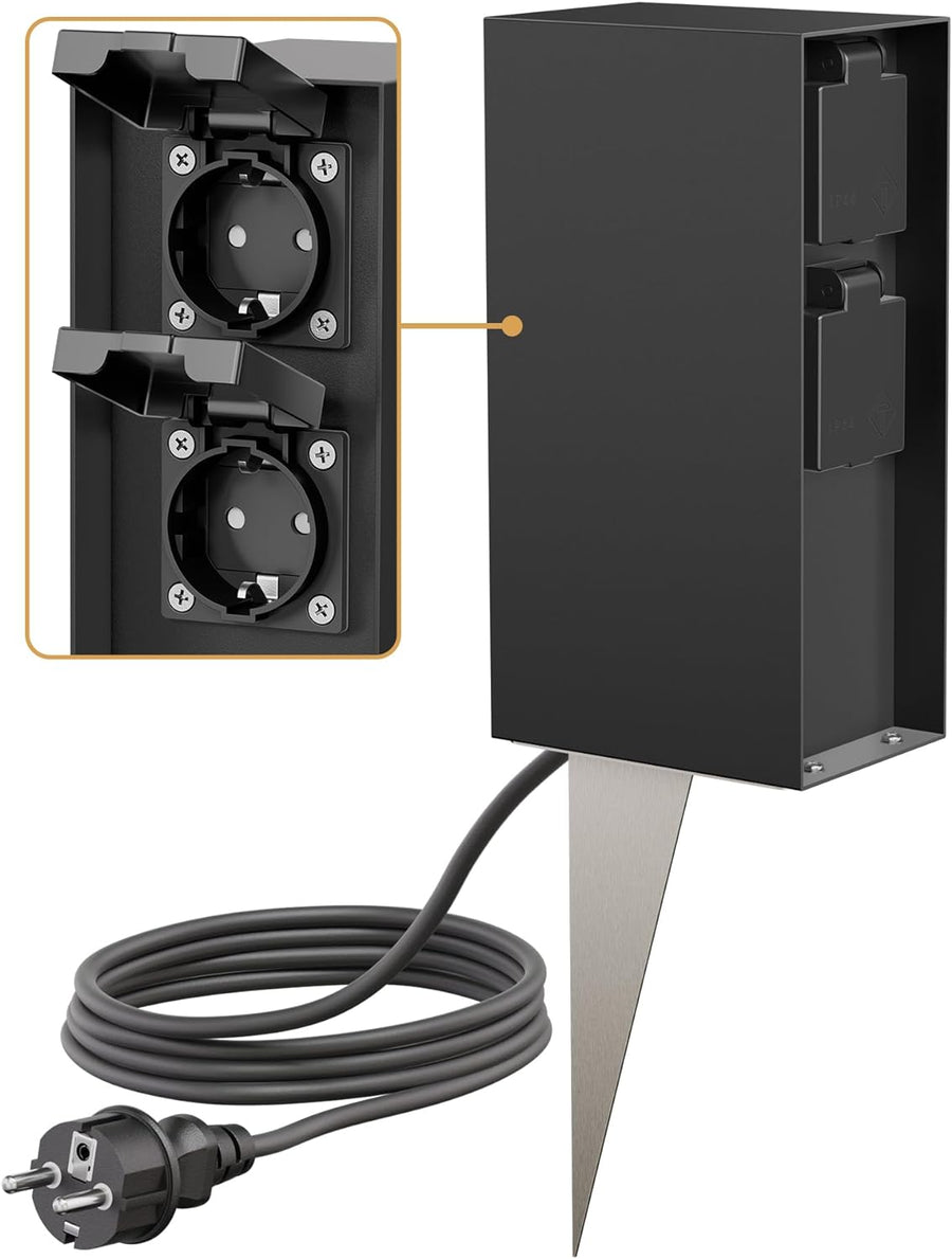ledscom.de Gartensteckdose POMI mit Erdspiess, Outdoor, IP44, 4-fach, schwarz, eckig, 23cm, 2 Stk. 2