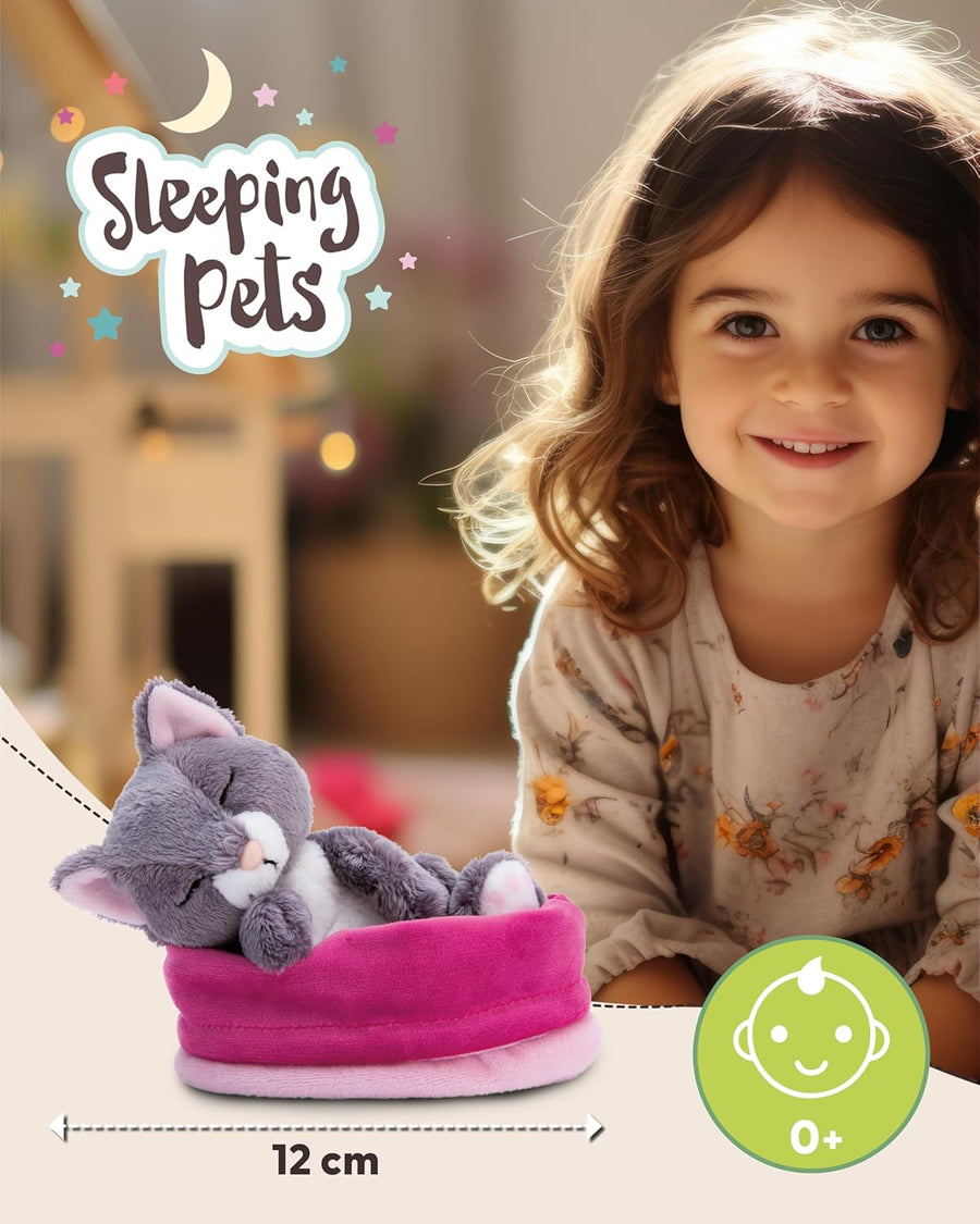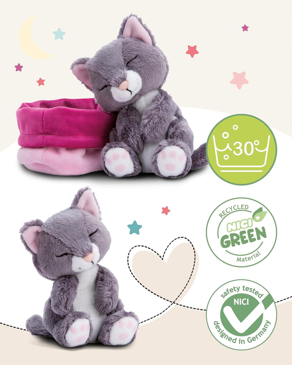 NICI Kuscheltier Katze grau 12cm schlafend im Körbchen, Katze Grau