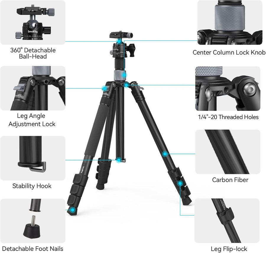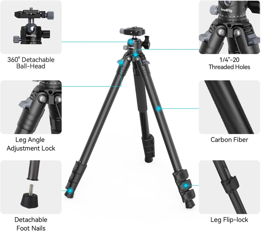 SMALLRIG Leichtes, kompaktes Kohlefaser-Stativ mit abnehmbarem Einbeinstativ, 360°-Kugelkopf mit Sch