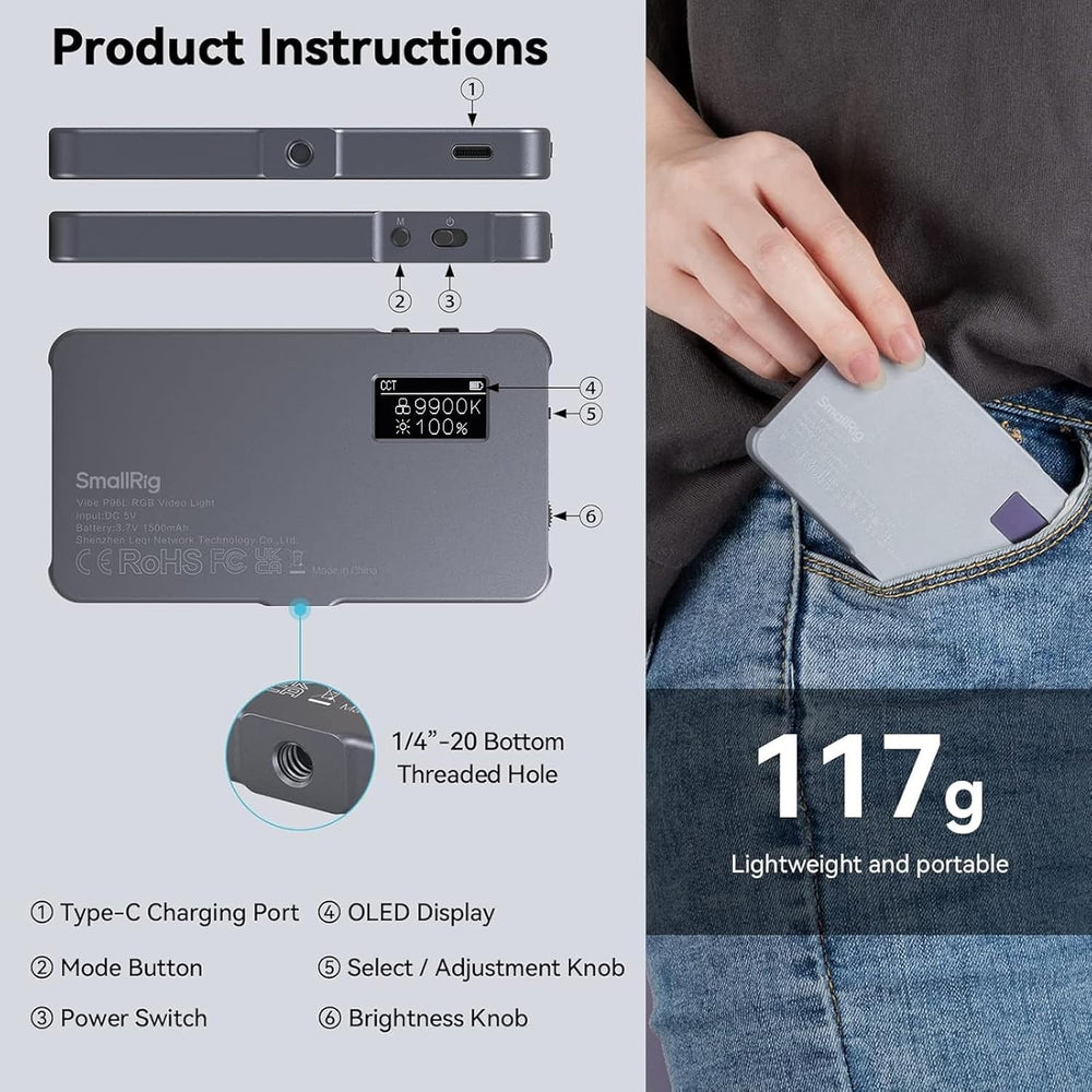 SMALLRIG Led Videoleuchte RGB, Leichtes Fotolicht mit Integriertem LCD-Display, 2500K–8000K, CRI 96,