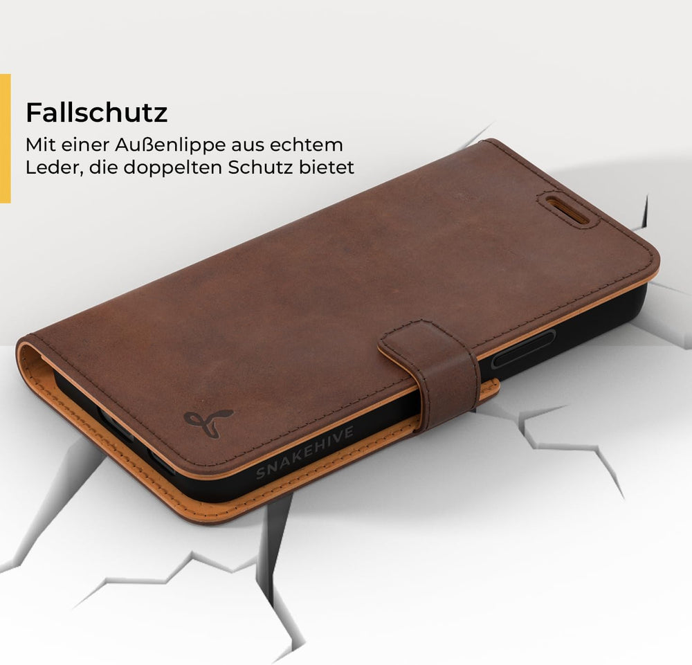 Snakehive Schutzhülle für iPhone 15 - Klapphülle Echte Lederhülle mit Standfunktion - Handmade in Eu