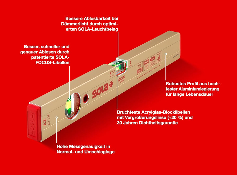 Sola SM red Wasserwaage aus Aluminium, 50 cm, mit 2 Libellen