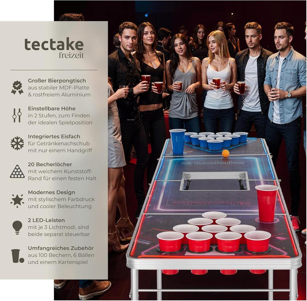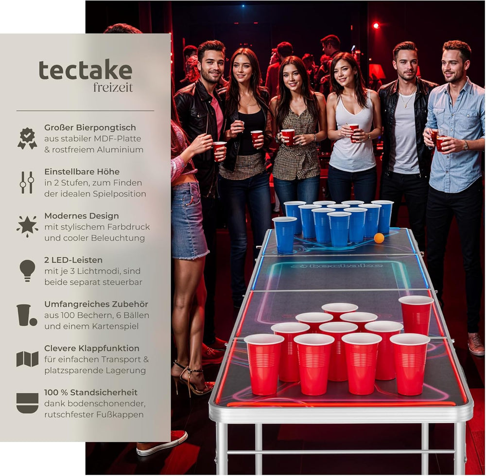 tectake® Bierpong Tisch mit Party Deko LED Beleuchtung, Tisch höhenverstellbar, Klapptisch, Set mit