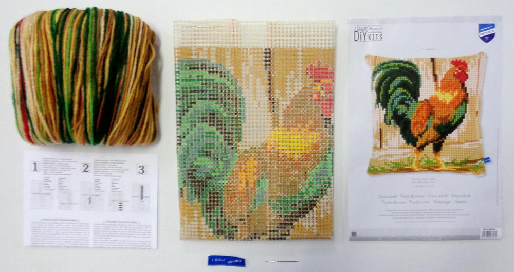 Vervaco Kreuzstichkissen Huhn Kreuzstickpackung vorgedruckt, Stramin, weiss, 40 x 40 x 0,3 cm