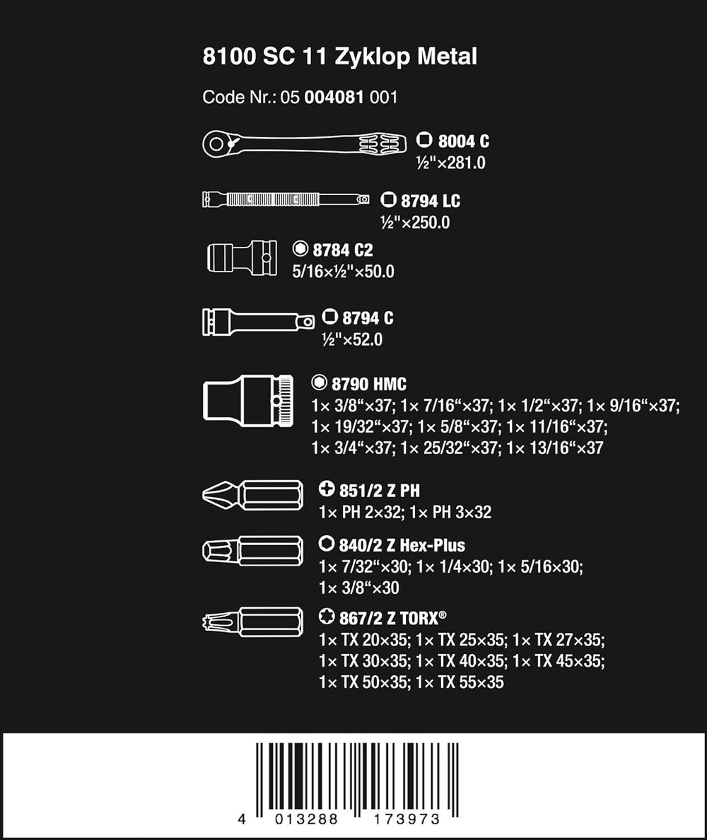 Wera 05004081001 8100 SC 11 Zyklop Metal-Knarrensatz, Umschalthebel, 1/2 Zoll -Antrieb, zöllig, 28-t