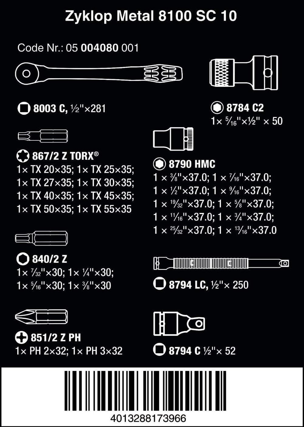 Wera 05004080001 8100 SC 10 Zyklop Metal-Knarrensatz, Durchsteckvierkant, 1/2 Zoll -Antrieb, zöllig,