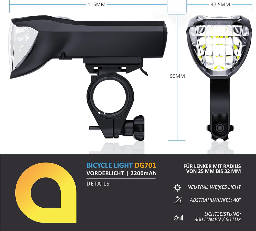 CSL - LED Fahrradlicht Frontlicht Vorderlicht, Fahrradbeleuchtung vorne, 50 LUX, USB aufladbar, StVZ