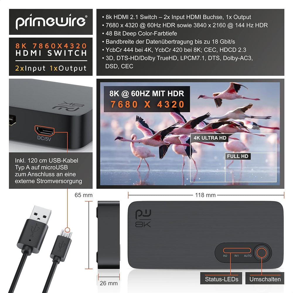 CSL - Switch HDMI Splitter, 8K Aluminium HDMI Switch 2 in 1 Out UHD HDMI Verteiler, HDMI Umschalter