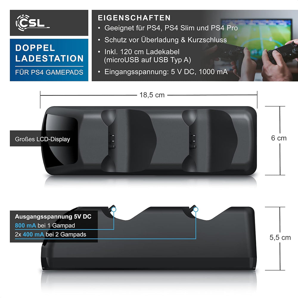 CSL - Ladestation für PS4 Gamepads – mit Mikro USB Ladekabel – PS4 Ladegerät - Doppeltes Schnelllade