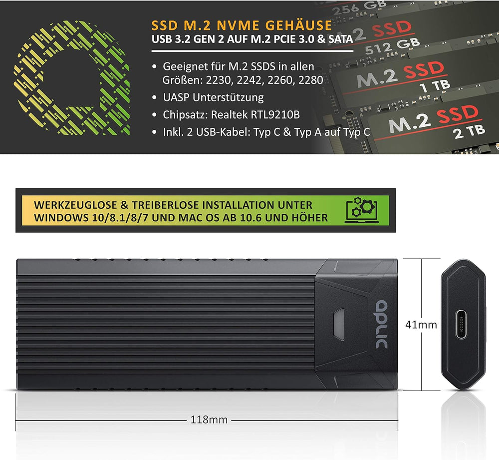 CSL - USB 3.2 Gen 2 SSD M.2 Festplattengehäuse USB 3.2 Gen 2 auf PCIe 3.0 und SATA - bis zu 10Gbps -