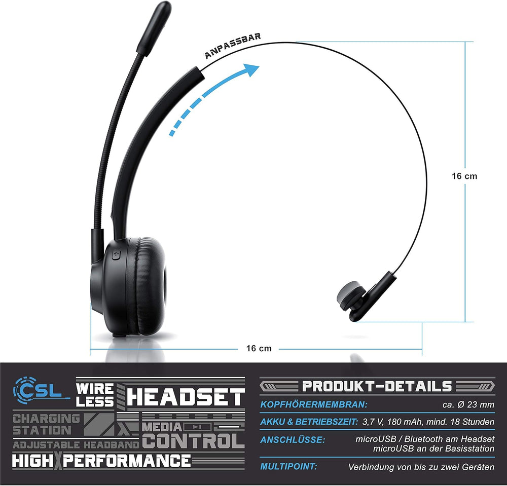 CSL - kabelloses Headset mit Ladestation - Mono Bluetooth Headset mit Mikrofon - USB Ladeport - Mult