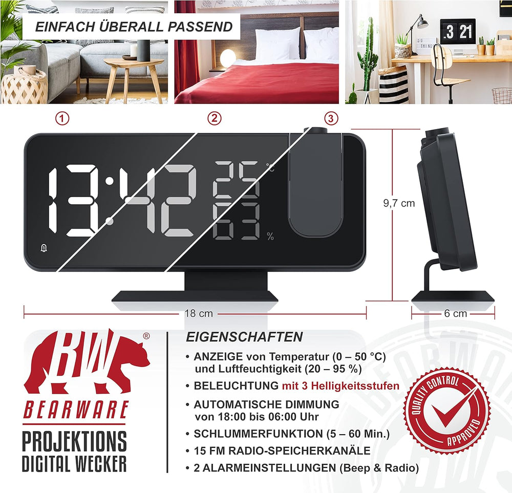 CSL - Radiowecker digital – Projektionswecker – 7 Tasten – 2 Alarme – Projektion und Licht – Autodim