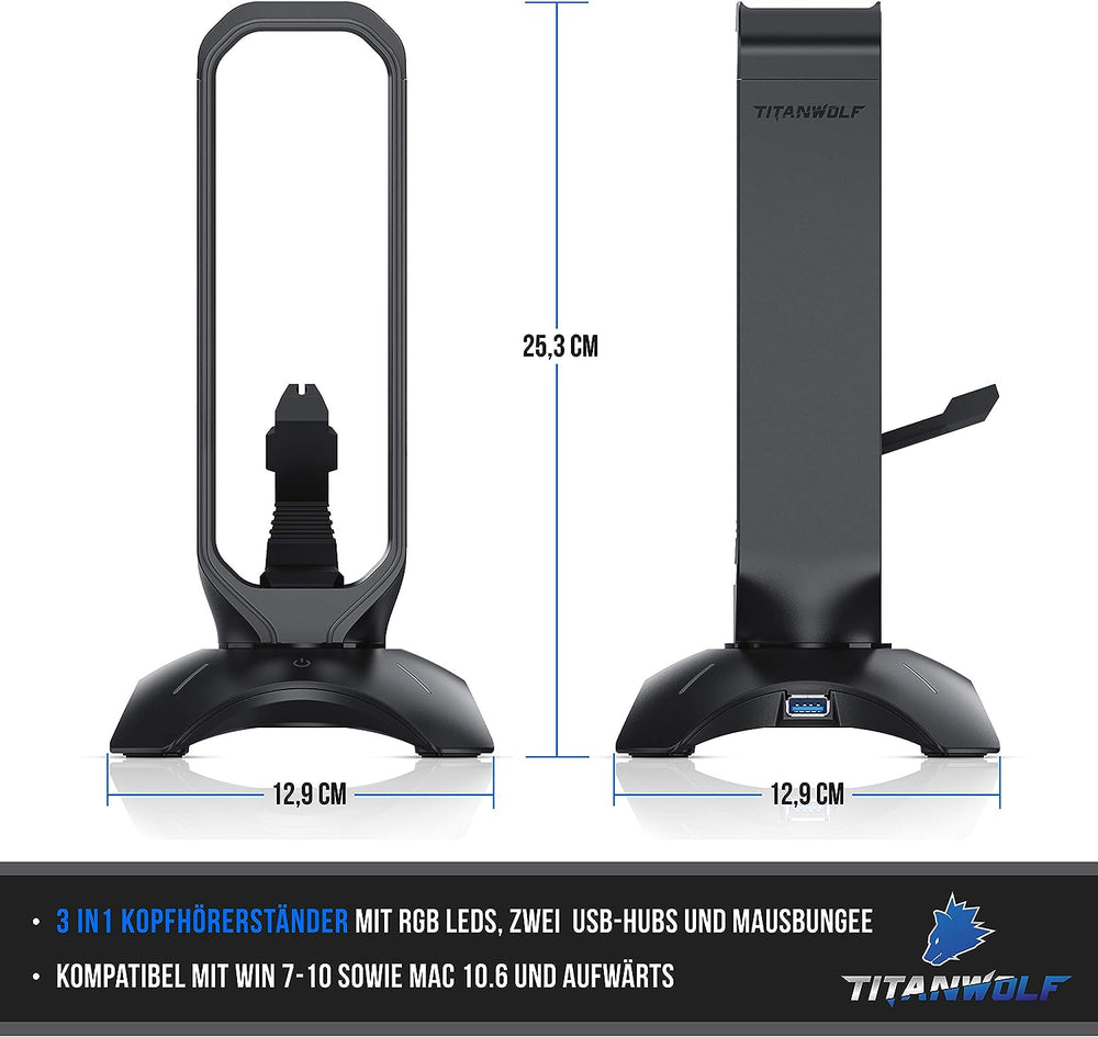 CSL - Kopfhörer Ständer mit 2 x USB 3.2 Gen1 Hub, Mausbungee, Kopfhörerständer 3in1, 6 RGB Farben Fa