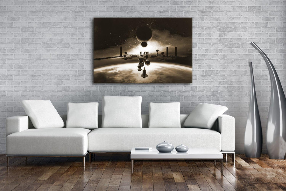 Dark ISS über der Erde Format: 80x60 Effekt: Sepia als Leinwandbild, Motiv fertig gerahmt auf Echtho
