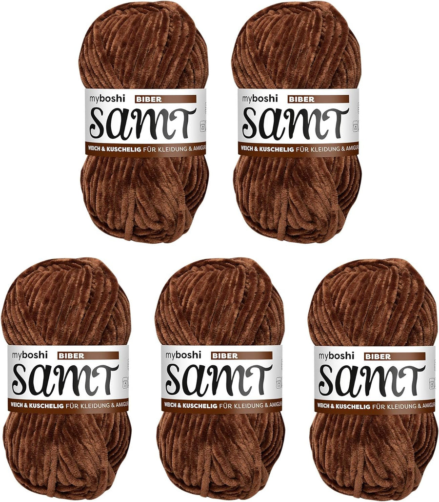 myboshi Samt, 100% Chenille-Garn, Braun - Biber, 100g, 100m, 5 Knäuel, Wolle zum Häkeln und Stricken
