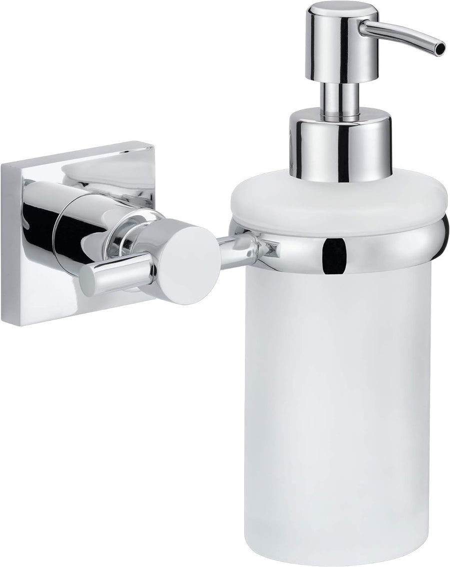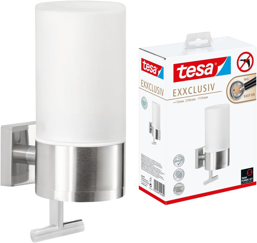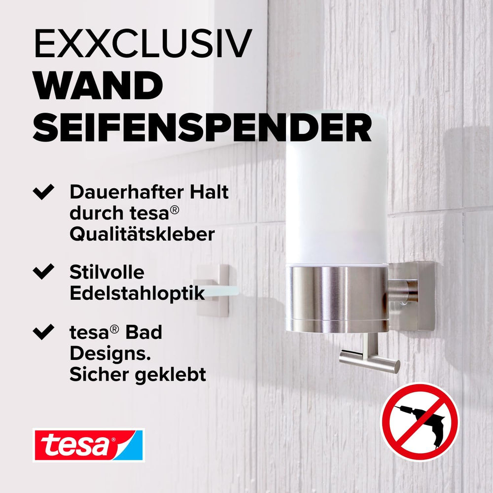 tesa EXXCELLENT Seifenspender-Set, Milchglas und verchromtes Metall - Flüssigseifenspender zur Wandb