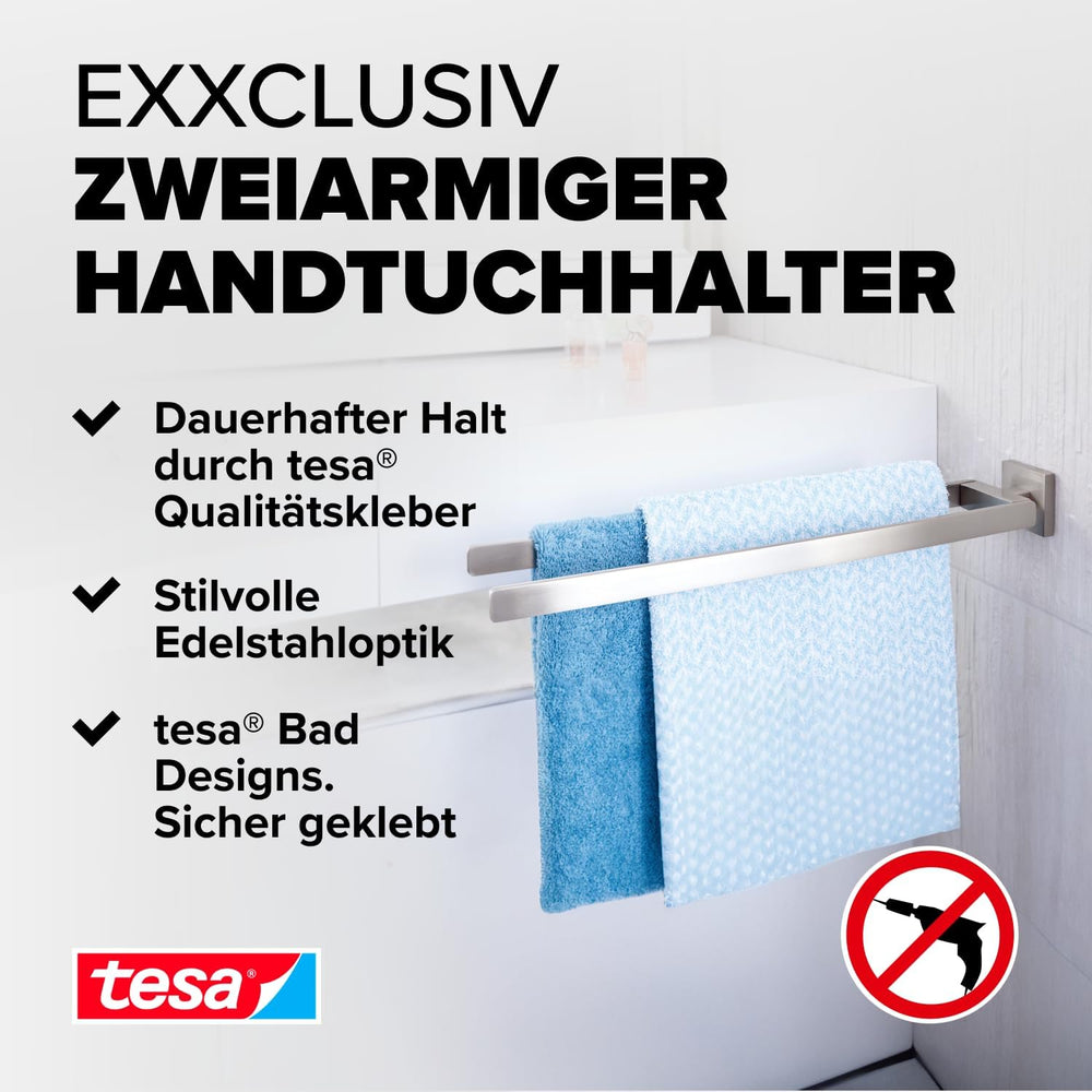tesa EXXCLUSIV Bad Handtuchhalter, 2-armig, verchromt - rostfrei, zur Wandbefestigung ohne Bohren, i