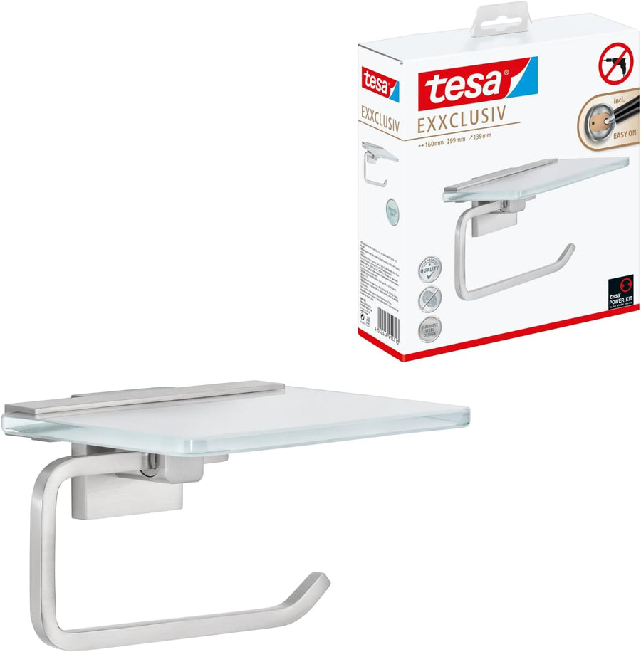 tesa EXXCLUSIV Toilettenpapierhalter mit Ablage aus Milchglas, verchromte Halterung - zur Wandbefest