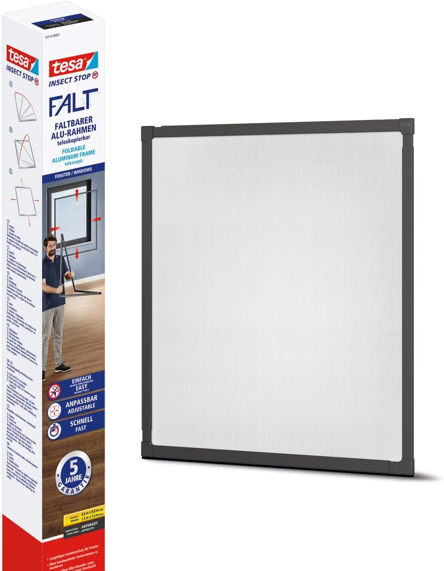 tesa Insect Stop FALT Fenster - Faltbarer Alu-Rahmen - Fliegengitter mit verstellbarem Teleskoprahme