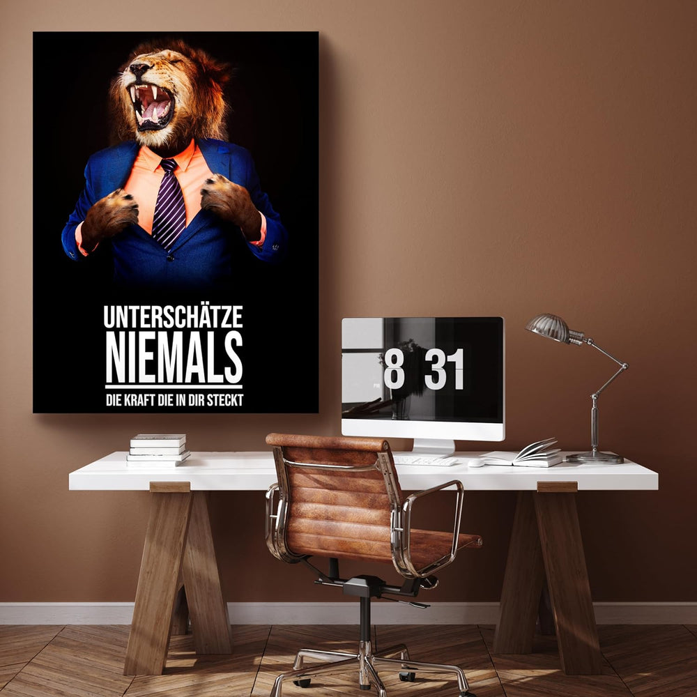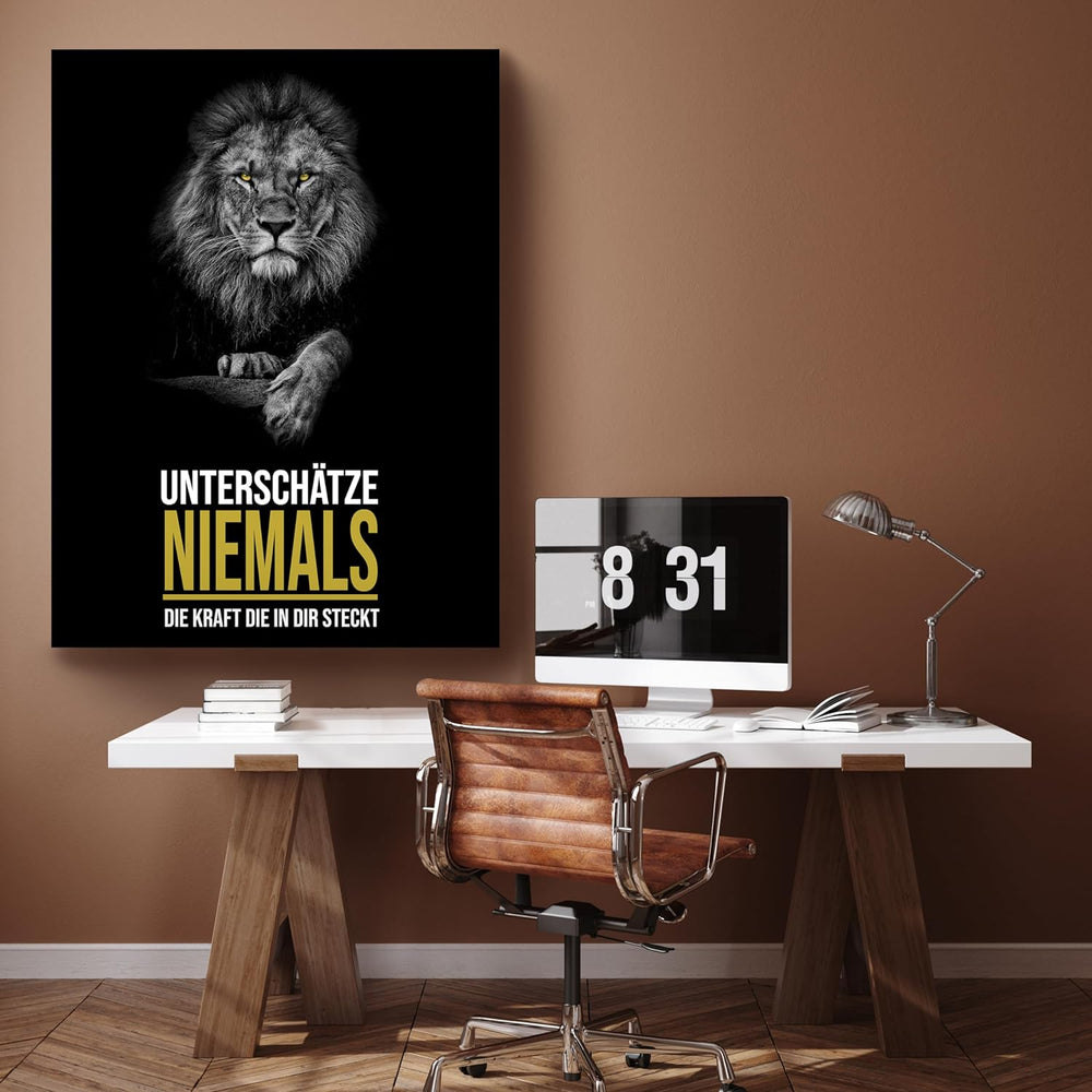 wandmotiv24 Leinwand-Bild Löwe, Grösse 60x45cm, Hochformat, Unterschätze Niemals die Kraft, Löwen, R