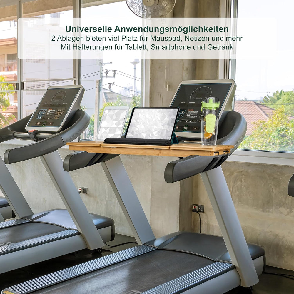 Relaxdays Laufband Schreibtischaufsatz, neigbar, Sicherungsbänder, Handy- & Getränkehalter, Bambus,