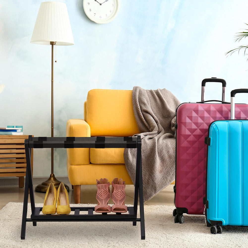 Relaxdays Kofferständer klappbar, 2er Set, Holz, H x B x T: 54 x 66 x 45 cm, 2 Ablagen, Kofferaufbew