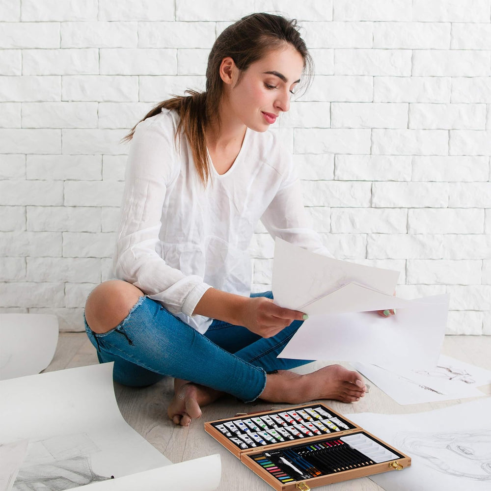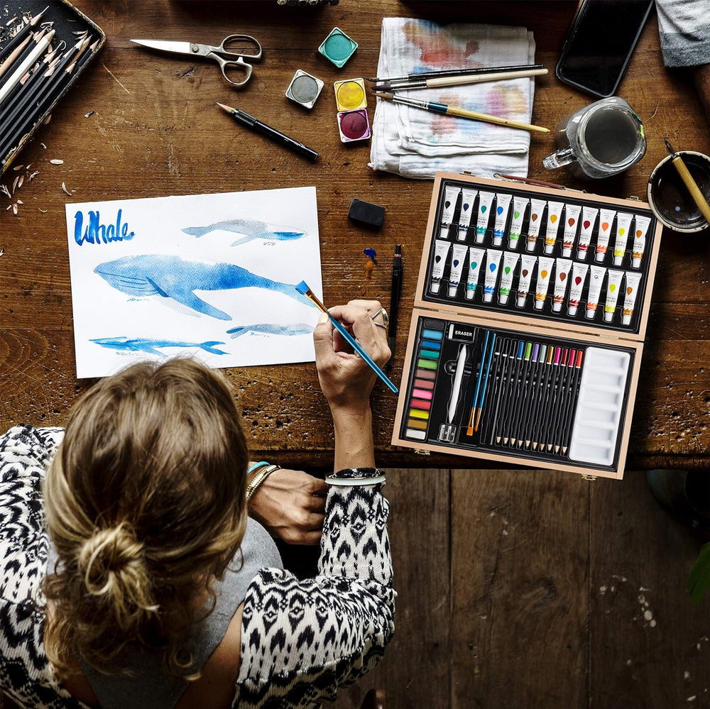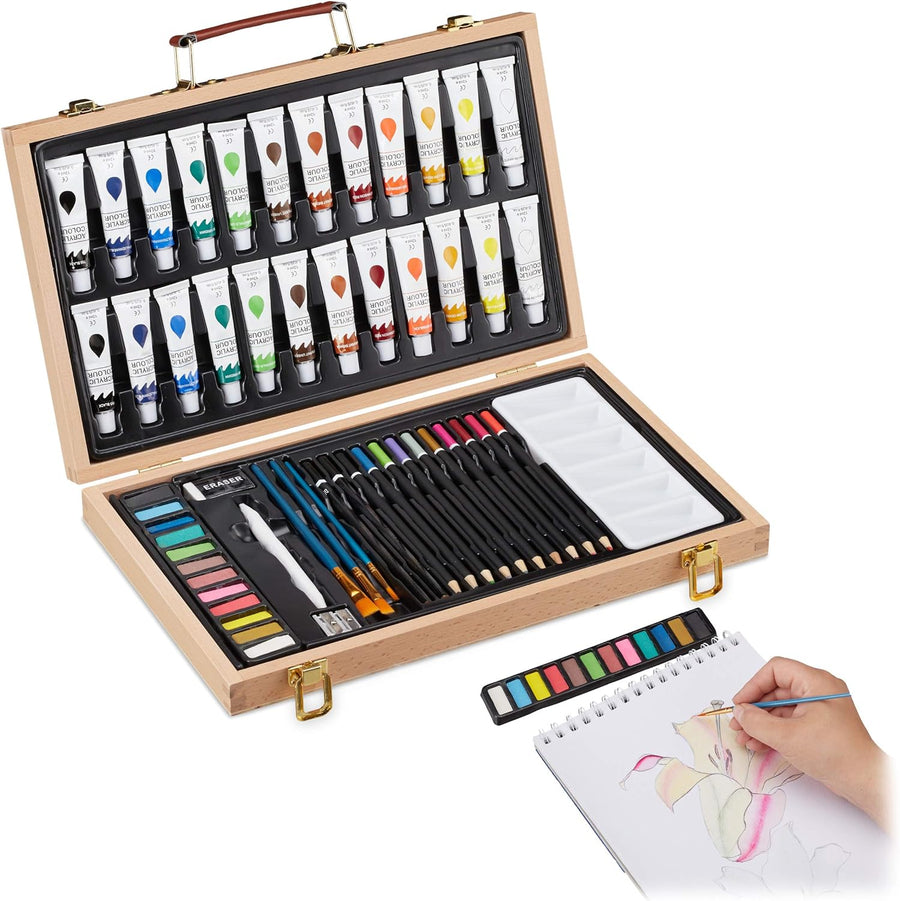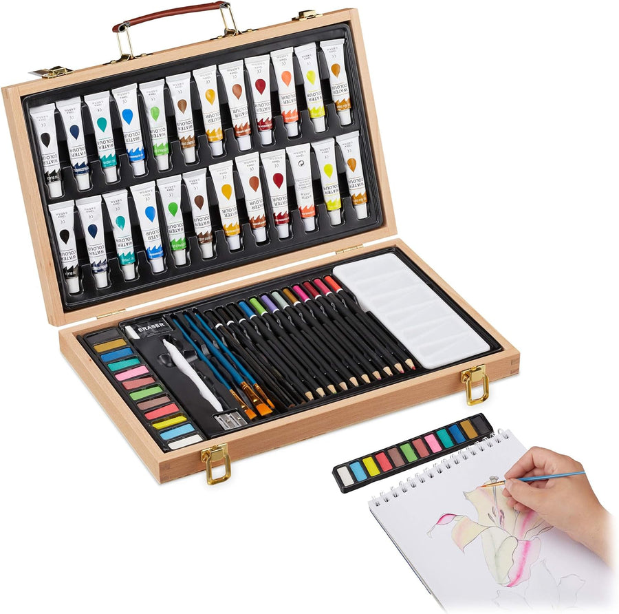 Relaxdays Malkoffer, 56-tlg. Malset Holz, Zeichenset mit Radierer, Spitzer, Bunt- & Bleistiften, Aqu