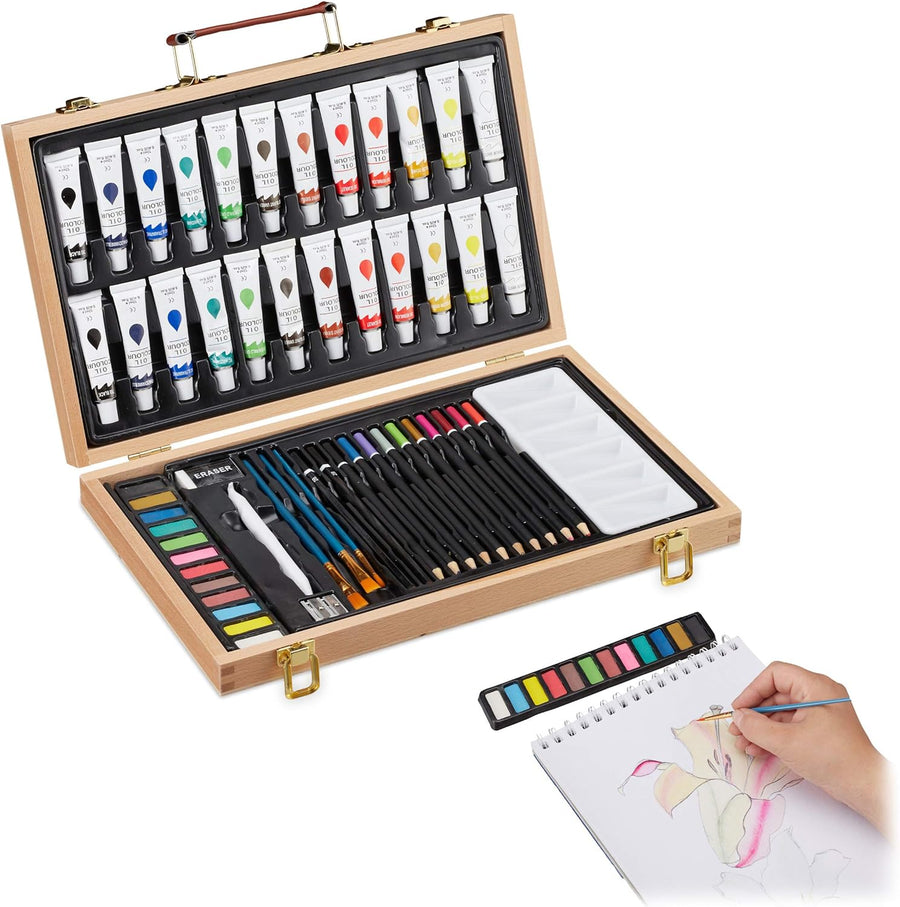 Relaxdays Malkoffer, 56-tlg. Malset Holz, Zeichenset mit Radierer, Anspitzer, Bunt- & Bleistiften, Ö