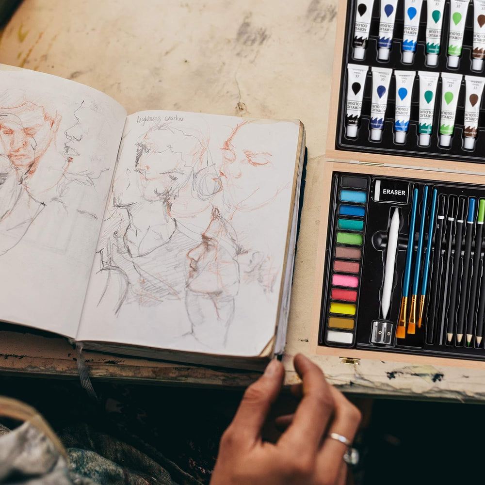 Relaxdays Malkoffer, 56-tlg. Malset Holz, Zeichenset mit Radierer, Anspitzer, Bunt- & Bleistiften, A
