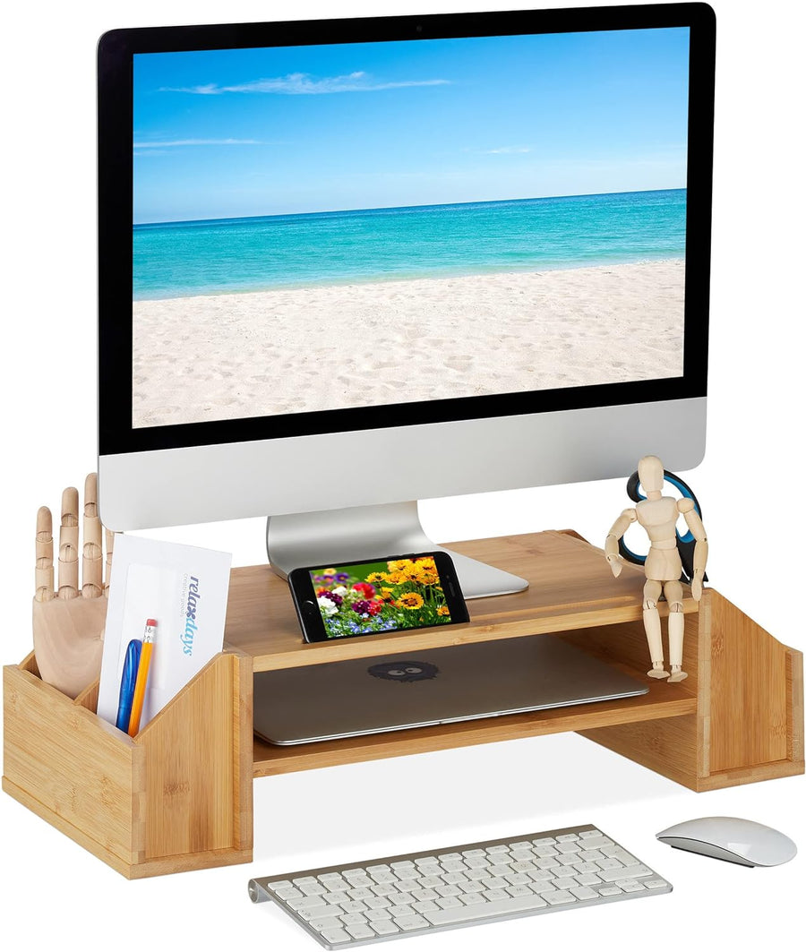 Relaxdays Monitorständer aus Bambus, Ablagen und Fächer, HBT: 16 x 57,5 x 25 cm, Bildschirmständer S