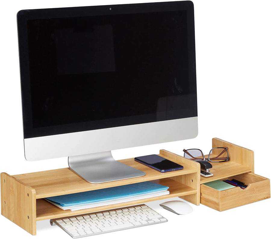 Relaxdays Monitorständer, XL Bildschirmerhöhung aus Bambus & MDF, 2 Schubladen, Organizer, HBT 11 x