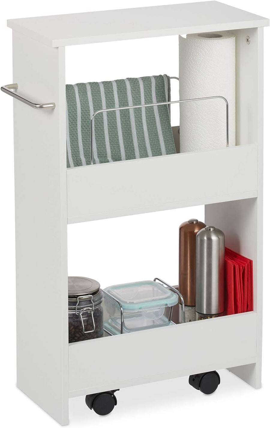 Relaxdays Nischenwagen, 2 Fächer, Nischenregal mit Rollen, 20 cm breit, schmales Regal Bad & Küche,