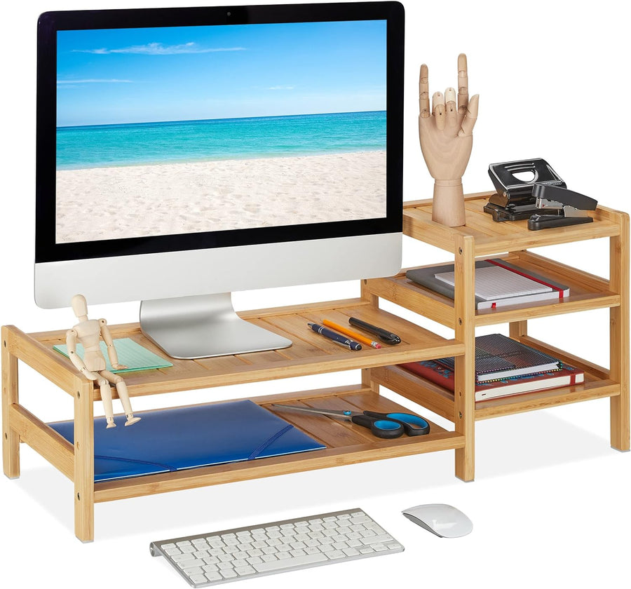 Relaxdays Monitorständer Bambus, 5 Ablagen, Bildschirmerhöhung Schreibtisch, HBT: 33x80x30 cm, Monit