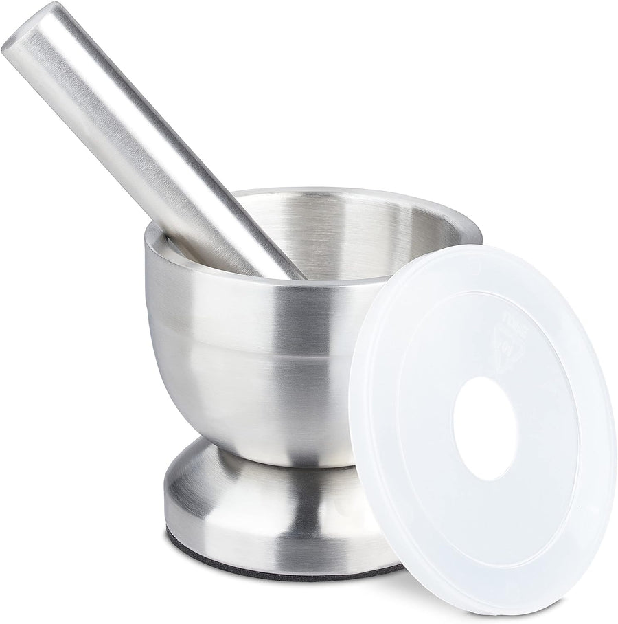 Relaxdays Mörser mit Stössel, aus Edelstahl, mit Deckel, Gewürze, Kräuter, Rutschfester Handmörser,