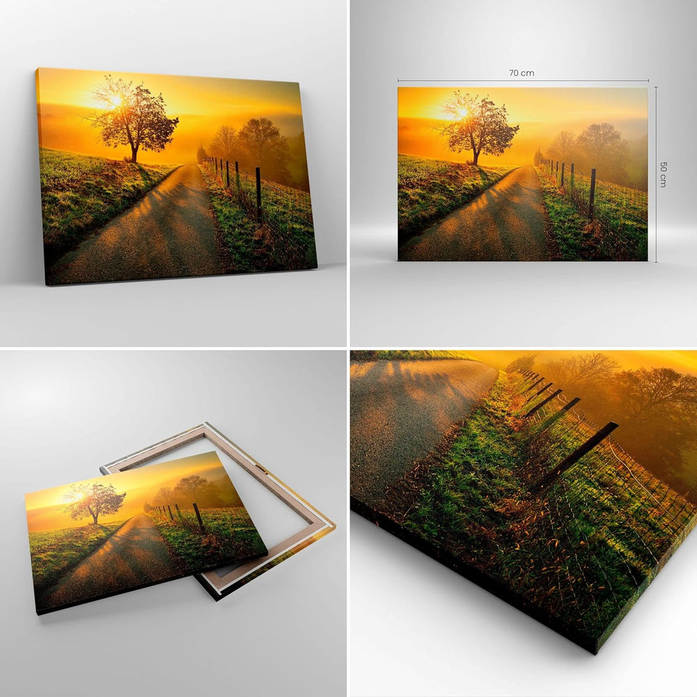 Bilder auf Leinwand Feld Strasse Baum Leinwandbild mit Rahmen 70x50cm Wandbilder Dekoration Wohnzimm