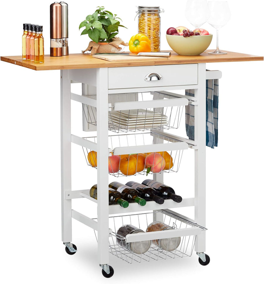Relaxdays Küchenwagen, Küchenbutler mit klappbarer Arbeitsplatte, Landhausstil, 3 Körbe, Messerblock
