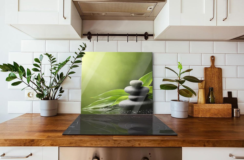 Zen Steine mit Blättern Herdabdeckplatte & Spritzschutz aus Echtglas | Für Herd-Kochfelder | 60x52 c