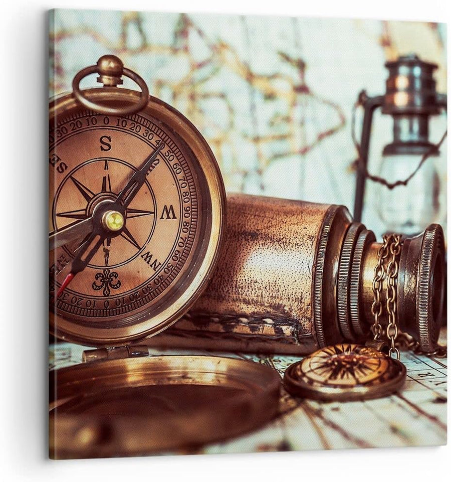 Bilder auf Leinwand Kompass Teleskop Abenteuer antik Leinwandbild 60x60cm Wandbilder Dekoration Wohn