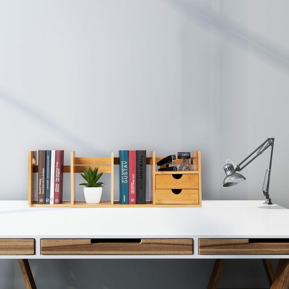 Relaxdays Schreibtisch Organizer Bambus, 2 Schubladen, Bücherregal ausziehbar, Ablage, HxBxT: 21 x 8