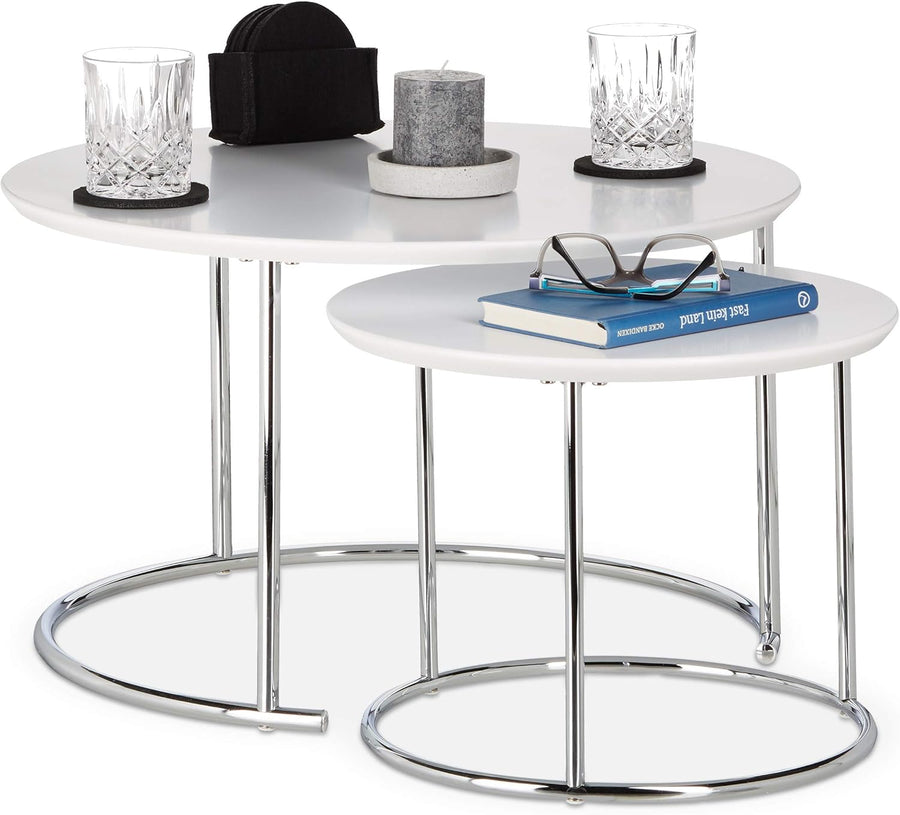 Relaxdays rund, Kleiner Couchtisch matt, Satztisch Holz und Metall, verchromt Beistelltisch 2er Set,