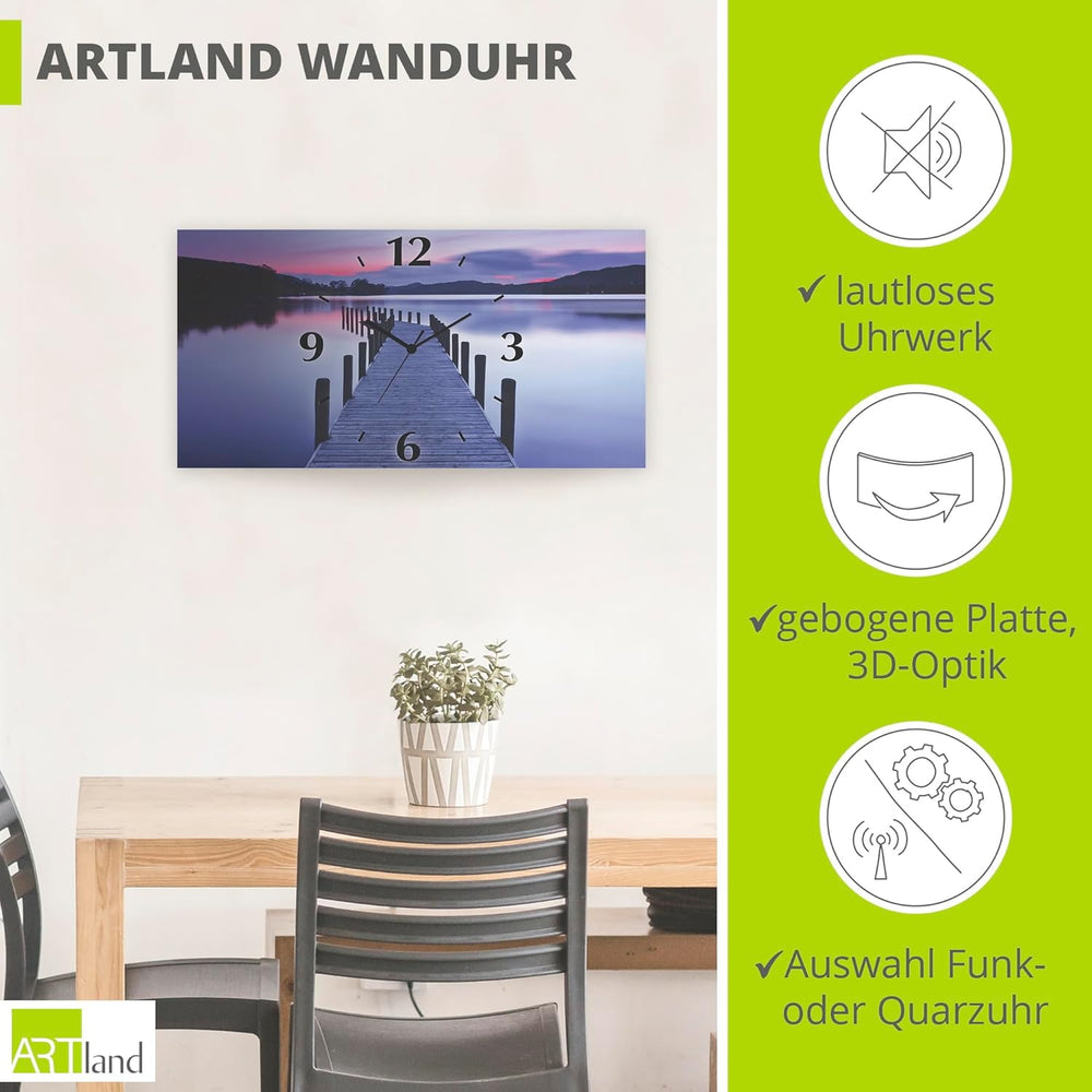 ARTLAND Wanduhr ohne Tickgeräusche Alu Quarzuhr 60x30 cm Rechteckig Lautlos Natur See Steg Sonnenauf