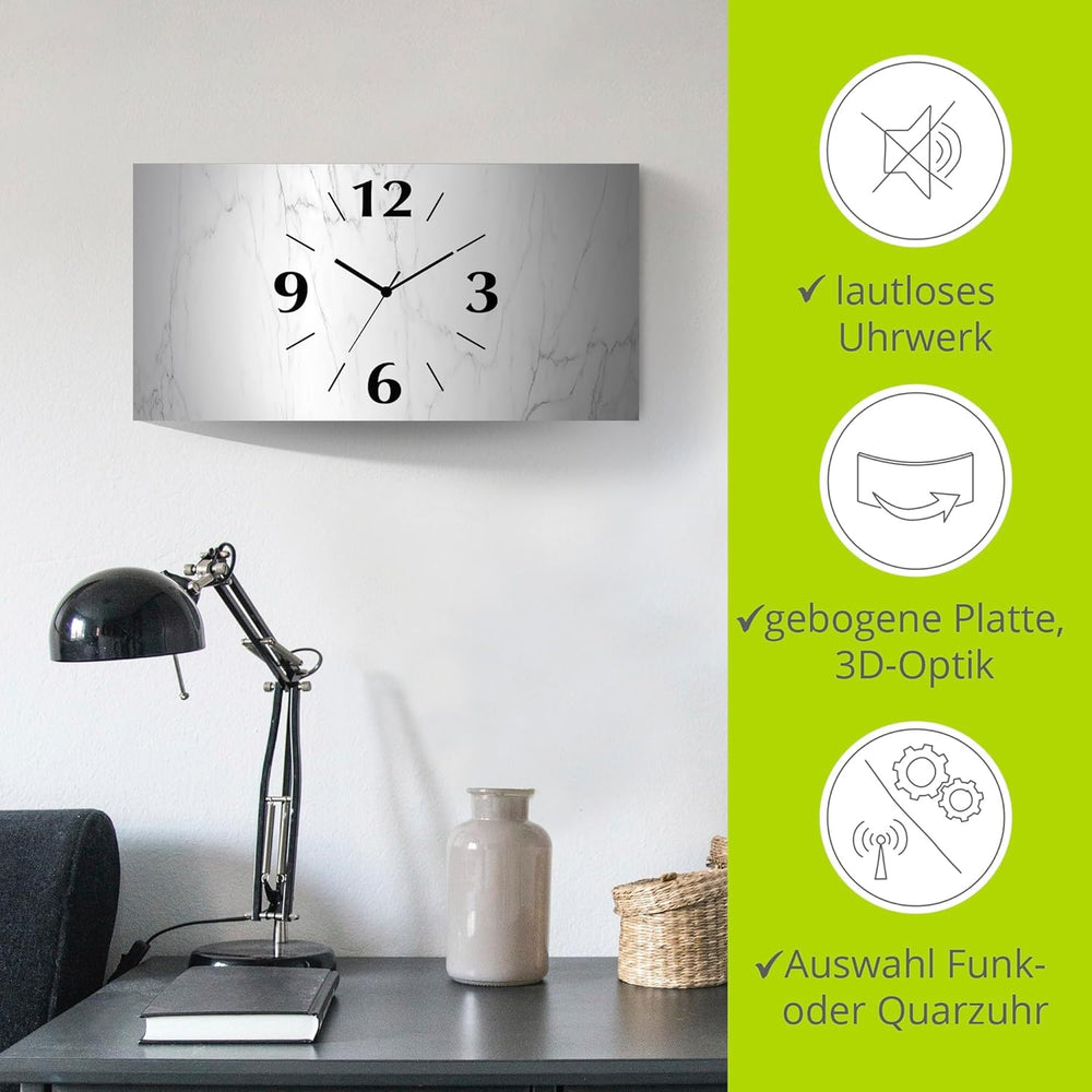 ARTLAND Wanduhr ohne Tickgeräusche Alu Quarzuhr analoge Quarzuhr 50x25 cm Weisse Marmor Stein Optik