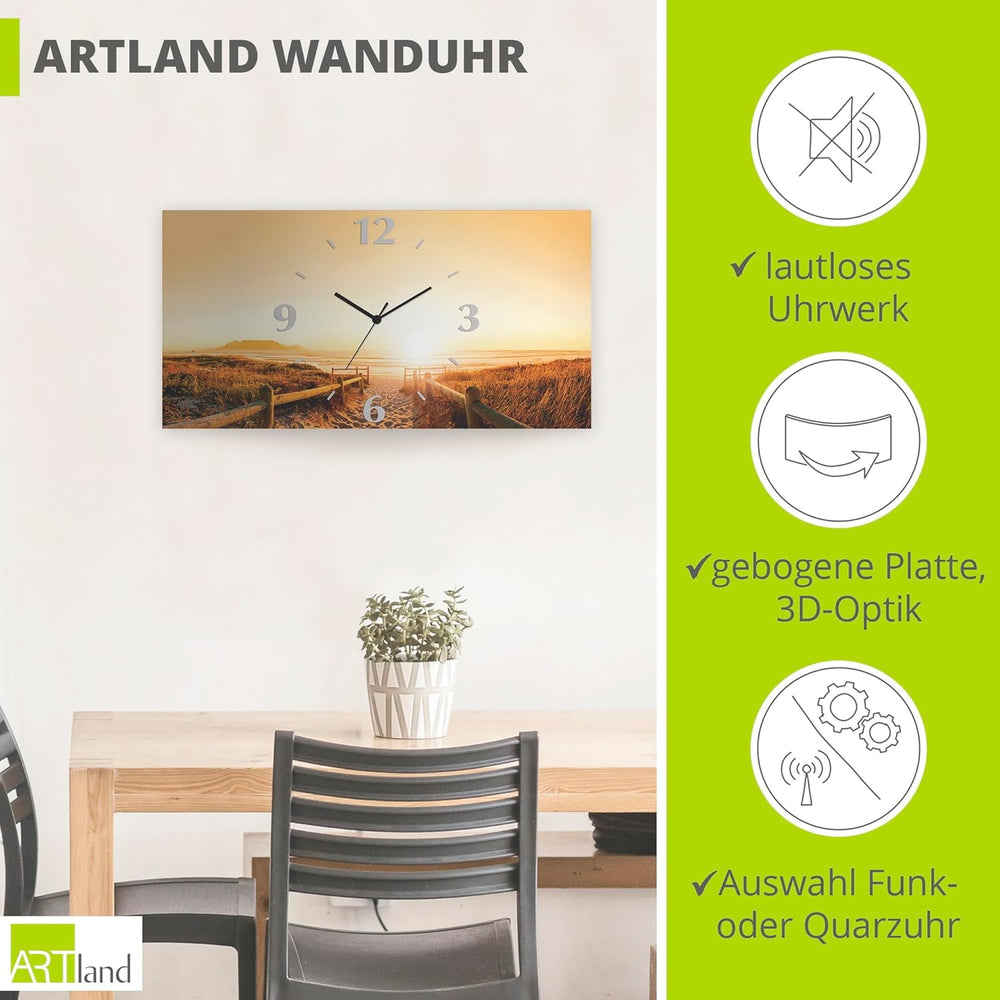 ARTLAND Wanduhr ohne Tickgeräusche Alu Quarzuhr lautlos 50x25 cm Rechteckig Landschaft Sonnenunterga