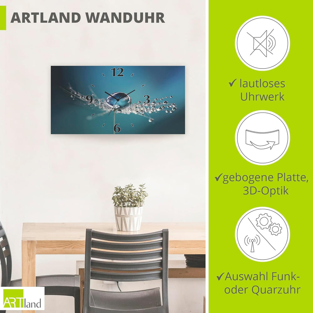 ARTLAND Wanduhr ohne Tickgeräusche Alu Quarzuhr lautlos 50x25 cm Rechteckig Blumen Pusteblume Wasser