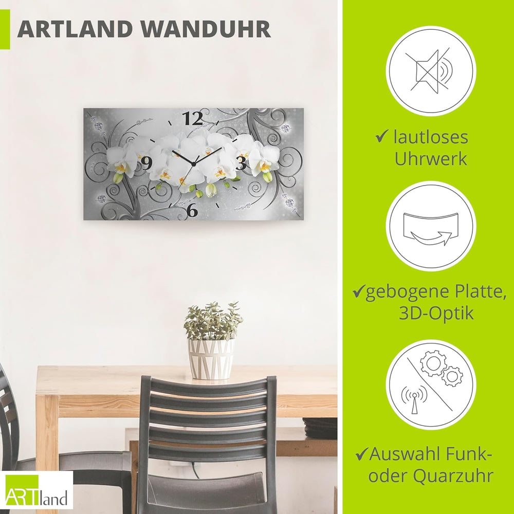 ARTLAND Wanduhr ohne Tickgeräusche Alu Quarzuhr lautlos 60x30 cm Rechteckig Blumenbilder Orchideen A