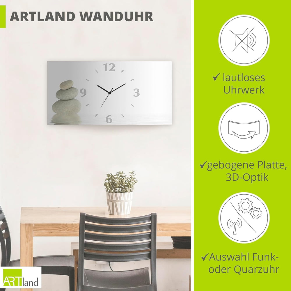 ARTLAND Wanduhr ohne Tickgeräusche Alu Quarzuhr 60x30 cm Rechteckig Lautlos Zen Asiatisch Spa Steine