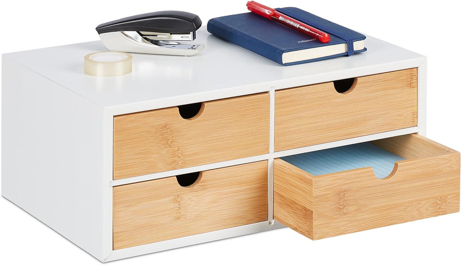 Relaxdays Schreibtisch Organizer, 4 Schubladen, für Büroutensilien, HxBxT: 14 x 33 x 21 cm, Bambus &
