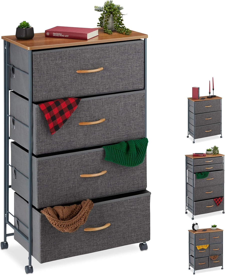 Relaxdays Schubladenschrank mit Rollen, 4 Stoff Schubladen, Deko Stoffschrank, Holzoptik, HBT 93 x 5