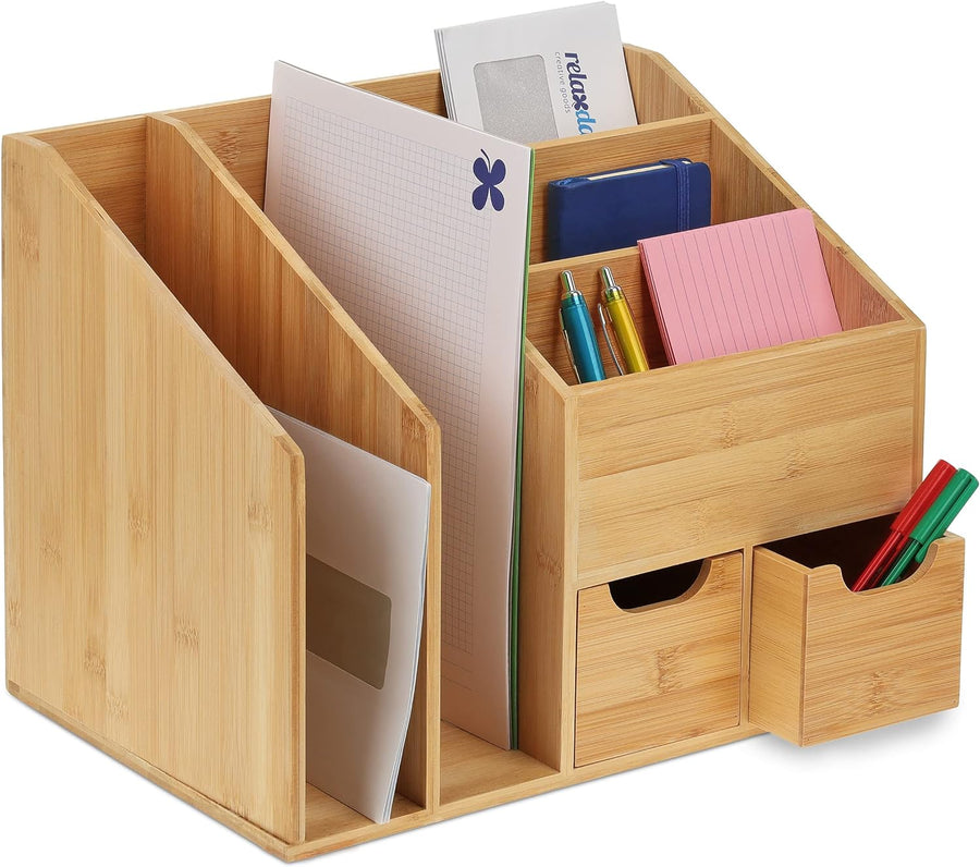 Relaxdays Schreibtisch-Organizer Bambus, Briefablage, 6 Fächer, 2 Schubladen, natürliche Maserung, H